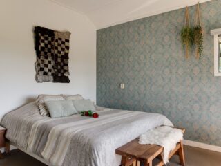 Ingericht met veel wit, een wand met prachtig behang, tweed vloerkleed en kunstzinnige wol-elementen